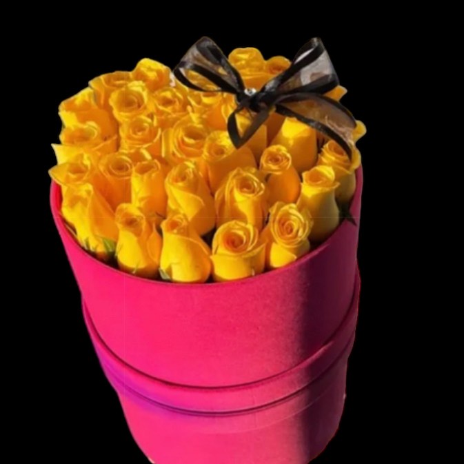 35 Fresh yellow roses in a hot pink soft fabric box.