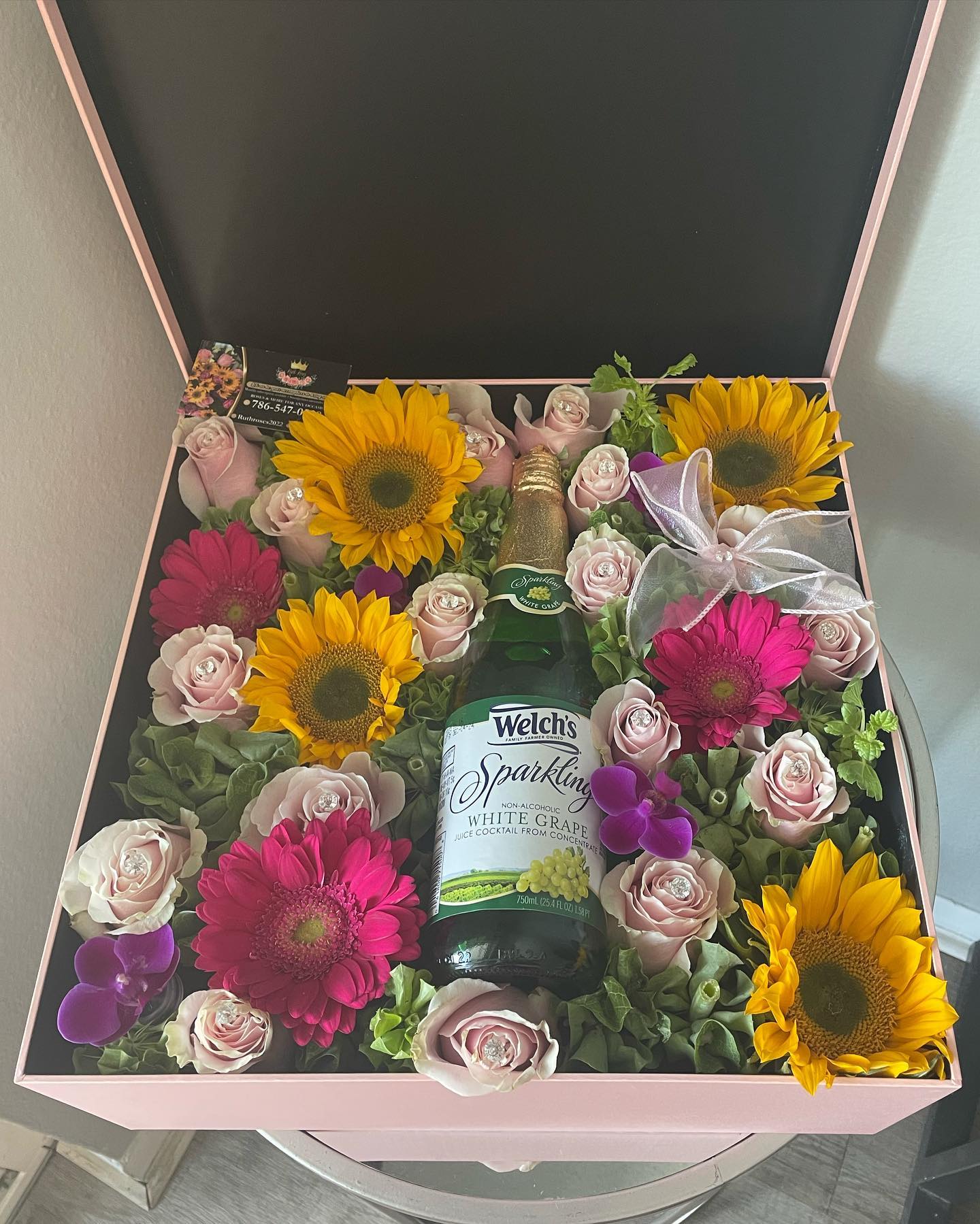 Una variedad de flores en una caja con vino sin alcohol! (El vino esta disponible en uvas rojas o verdes, o vino de fresa)