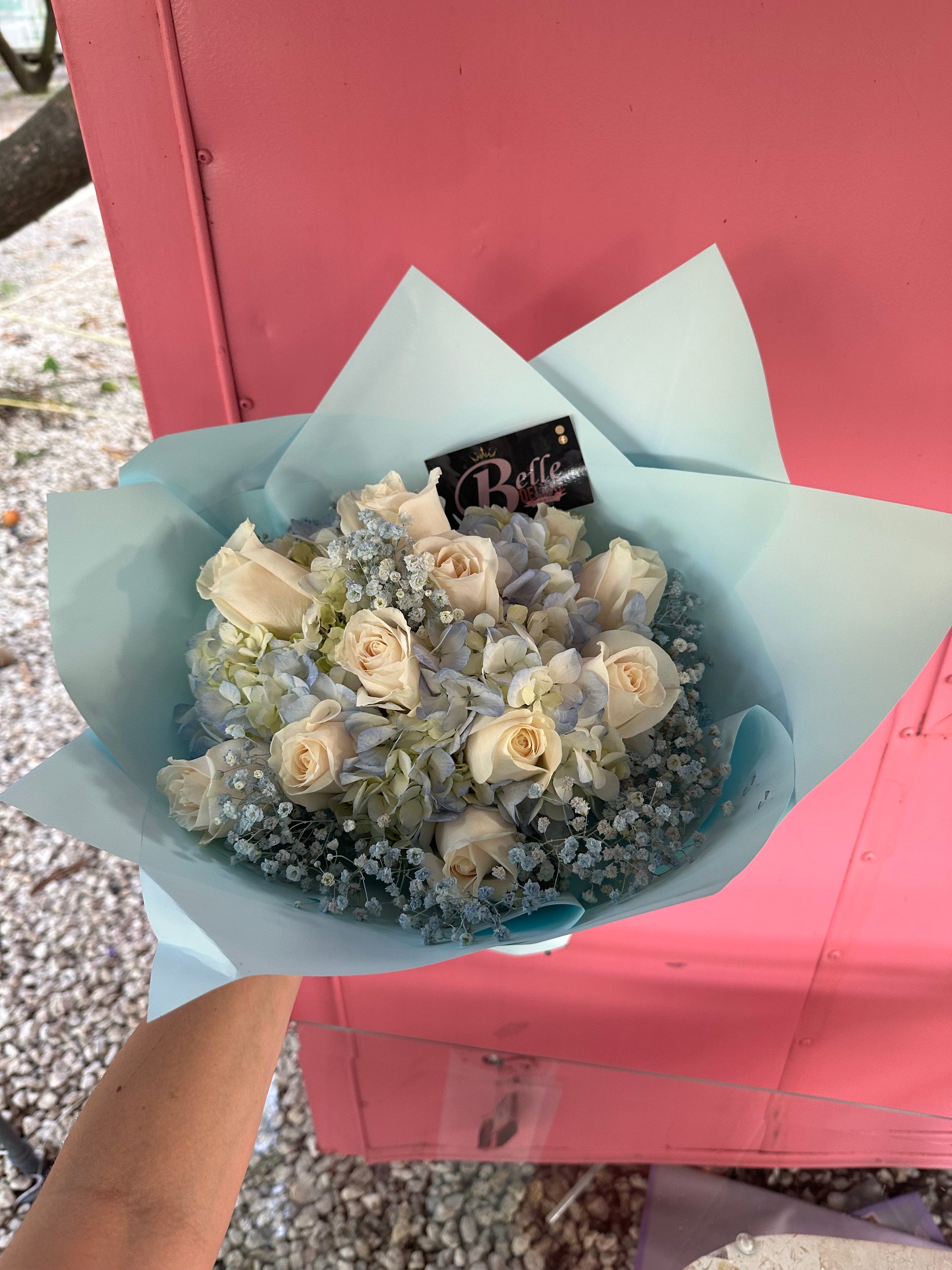 hortencias frescas con una docena de rosas y un poco de aliento de bebé azul al rededor!