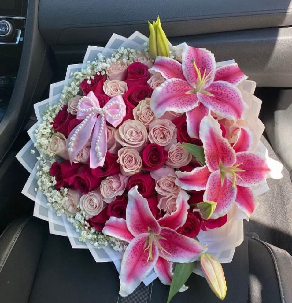 50 Rosas frescas rosadas y rojas con unas lilies y aliento de bebé!
