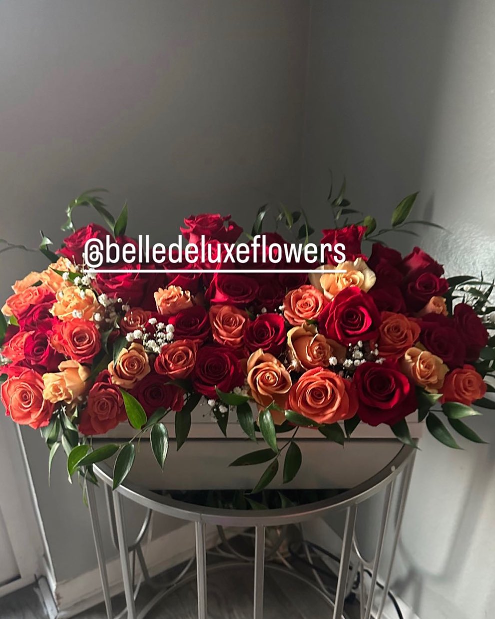 Una caja rectangular con cuatro docenas! Una combinación de rosas naranjas y rojas!