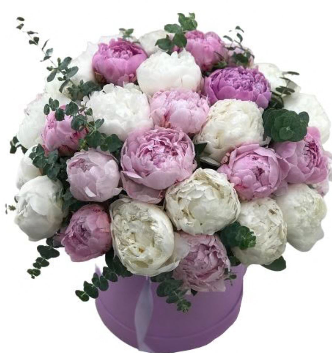 30 Peonis in a pink box with eucaliptos. 30 Peonis en una caja rosada con eucalipto.
