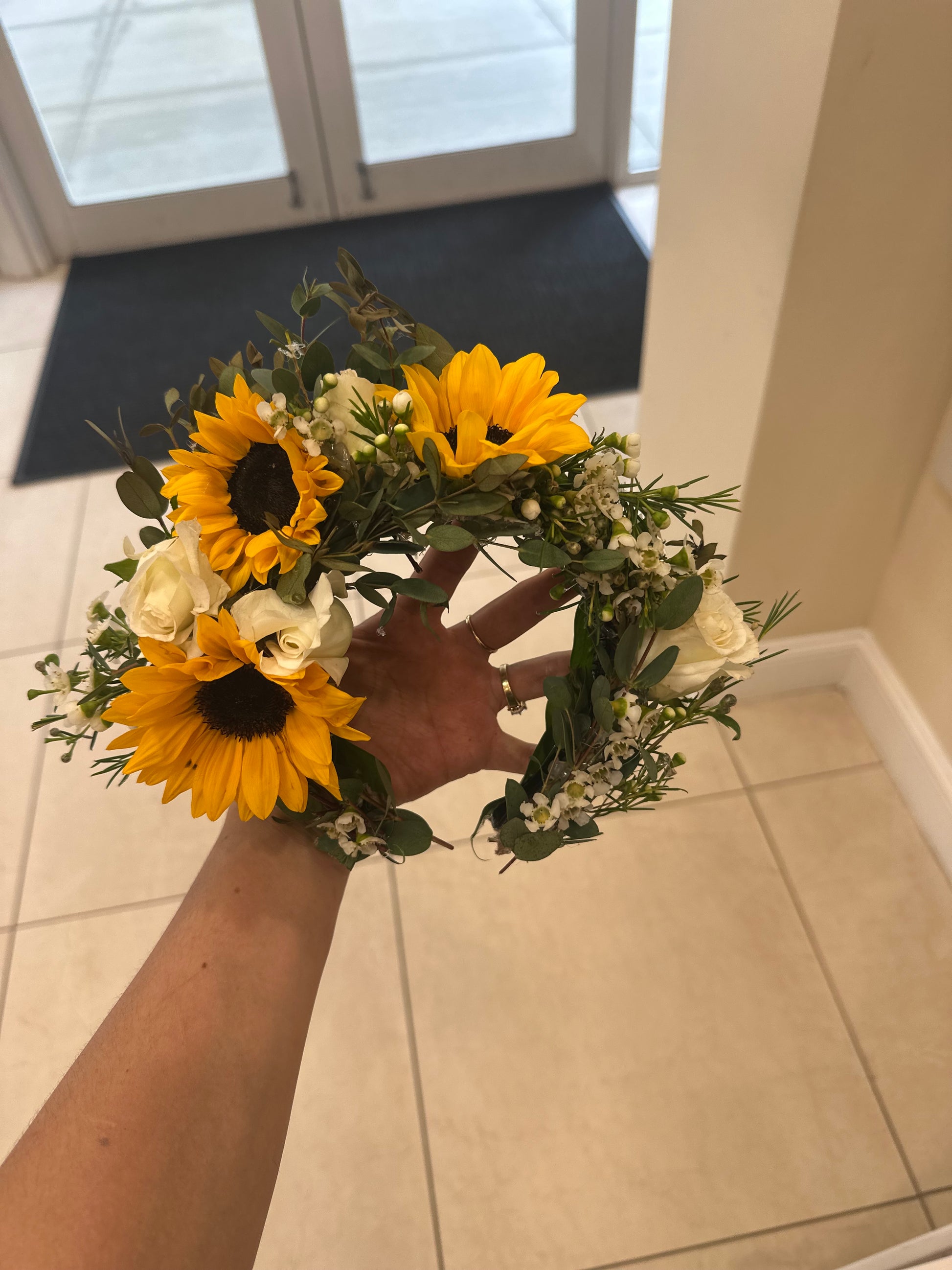 4 botones de flores, pulsera de flores, corona de flores, ramo de madrina, ramo de novia, flores en vases y dos arreglos de flores.