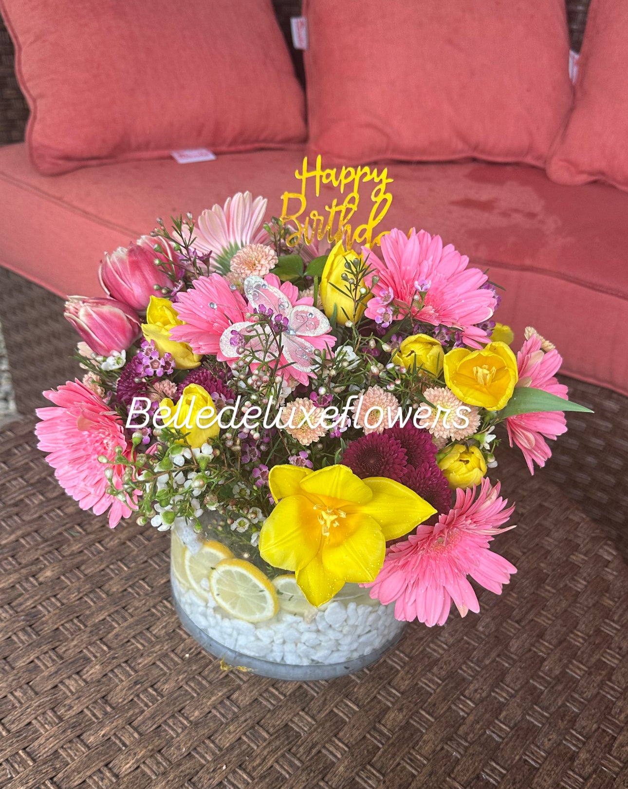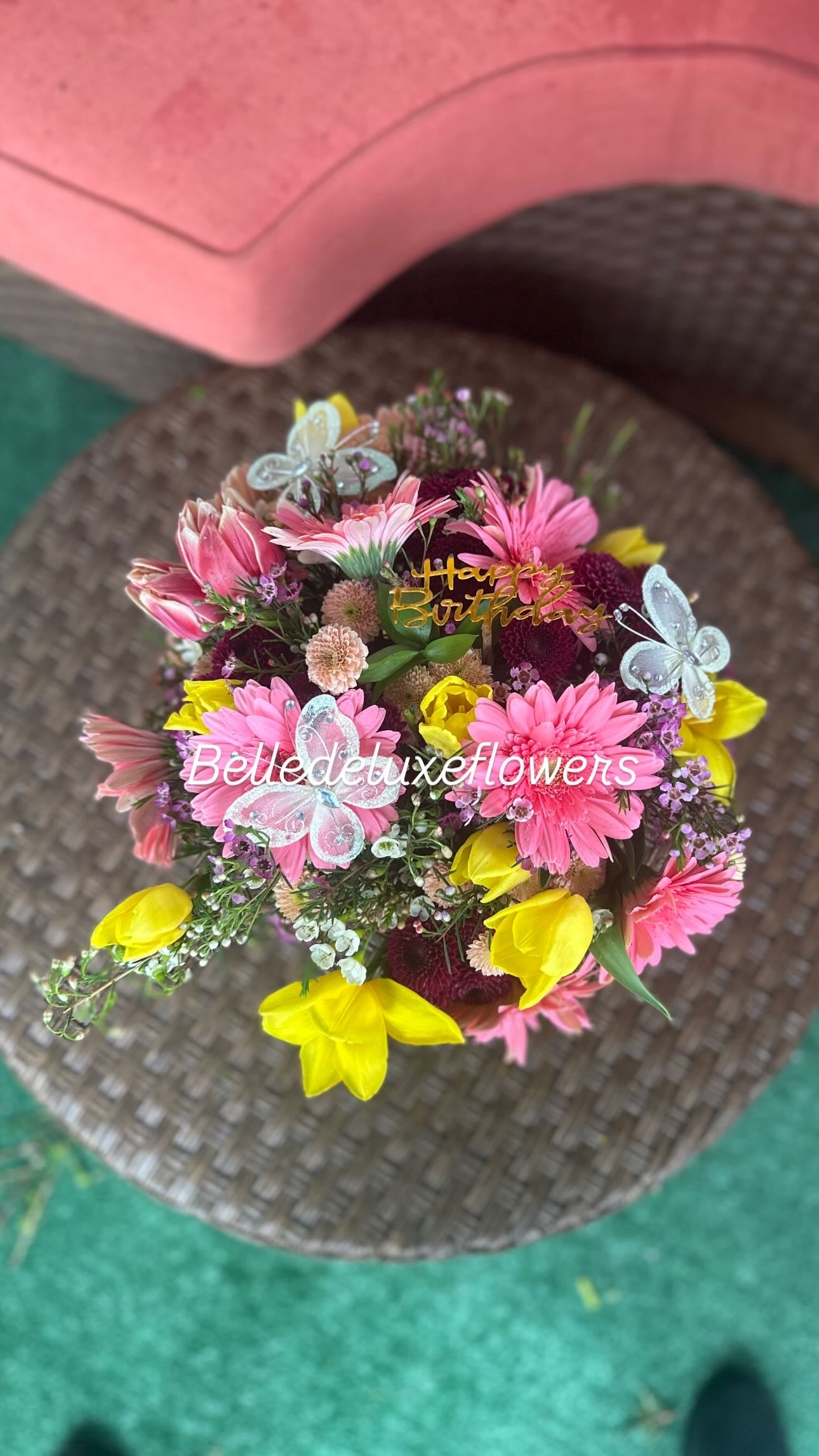 20 tulips, gerberas, chrysanthemum pompon, wax flowers, butterflies and happy birthday sign!