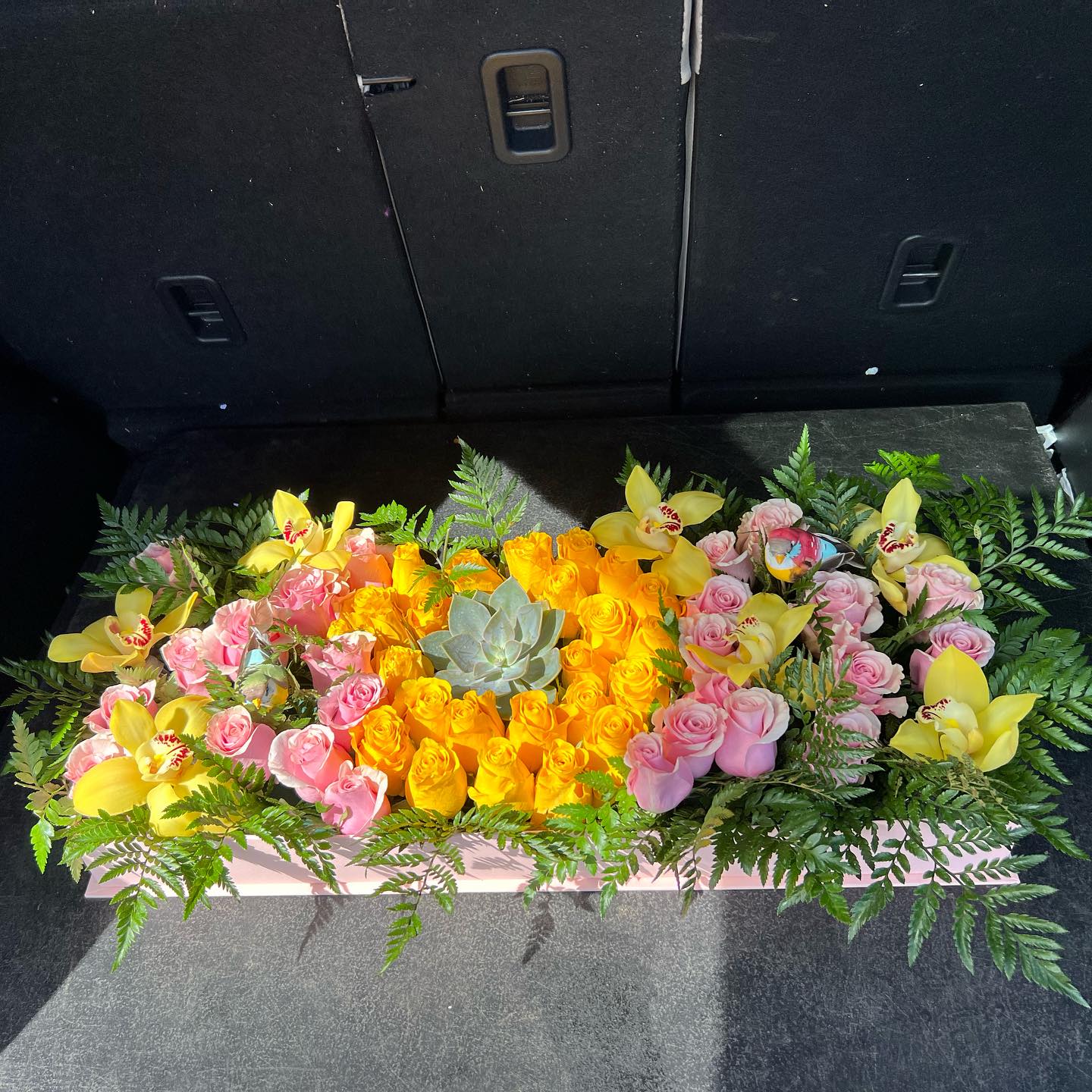 Una variedad de flores! La unica planta es la suculenta pero el resto es rosas amarillas, rosas rosadas, y orquideas amarillas!